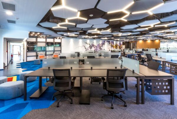O escritório da TV Globo expressa a identidade da marca, com mobiliário e arquitetura vibrante e moderna.